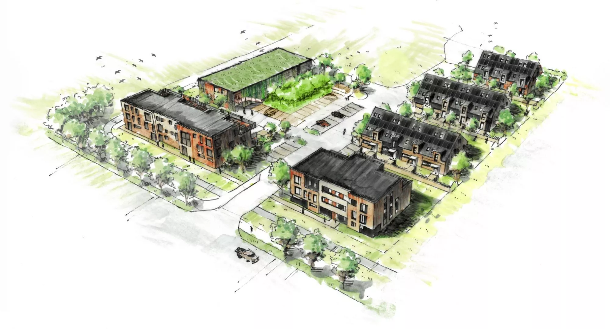 Wir realisieren ein Wohnquartier für alle Generationen mit verschiedenen Wohnformen: Kleine Single- oder Studentenwohnungen, großzügige Wohnungen für Paare, Seniorenwohnungen und Reihenhäuser mit Garten für